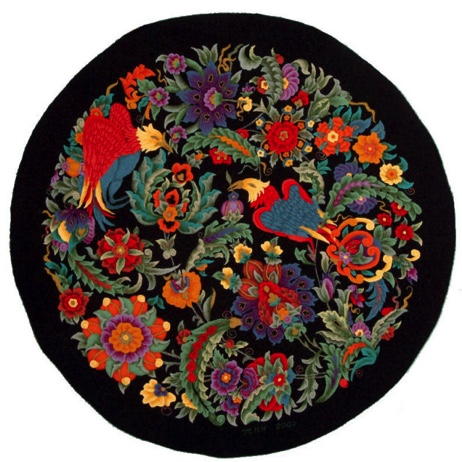 "Istanbul is mounted on ½" fiber board and hangs spotlighted in our dining room. It is my all-time favorite, an all-color palette on a dramatic black background, masterfully color planned by Nancy Blood. It has won many awards, among them Best in Show at the juried Pennsylvania Craftmen’s Gallery Show and 2nd place Readers’ Choice in Celebration. This was a joy to hook as no motif is repeated. However, the birds’ feathers lacked definition and became a blob. Either or both of my teachers, Meredith LeBeau or Nancy Blood, had taught us to take one thread from a very dark shade and buttonhole on the edge of each feather. The thread can be pulled up in loops and clipped off. The illusion of edge subtly does the trick!"