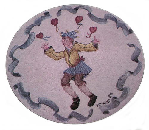 "I started hooking in 1991. I made eight rugs in my first year closely watched by my teacher, Jeanne Zook. The Juggler of Hearts was my first original rug and the first time I dyed all the wool for a rug. Jeanne was traveling in New Zealand, and I had no resource for supplies. It’s hard to believe now, but I loved the muted Jacobean colors, and I used them for this rug. This rug was designed for my husband who was learning to juggle at the time. The medieval juggler represents my husband who is juggling four hearts: mine, his, and the hearts of our two children--a difficult job. The rug was a Valentine’s day gift to my husband, Anthony."