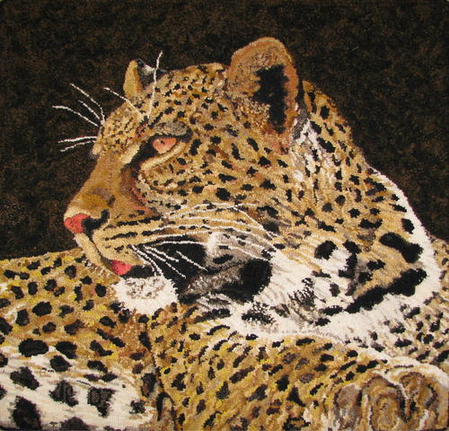 "The turn of his head, the distant look in his eyes and all those spots drew me to this pattern. It was so much fun to hook the spots. I used many different darks – black, gray and brown – to give depth and interest and so they didn’t look flat. I also was starting to incorporate textures in my pieces as I hooked this rug, so that increased my interest and pleasure while hooking and the realism of the finished piece. This is still one of my favorite animal portraits."