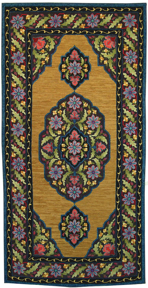 "Shah Abbas was the first rug for which I dyed all the wool myself: dip dyes, spot dyes, swatches and abrashing. I had come across formulae by a Nova Scotia teacher of rug hooking named Barbie Baker-Dykens who created transitional swatches that were different. I chose one of these formulae, which went from dark violet to light shades of lavender, blue and turquoise in the middle to dark turquoise for the flowers in this rug. The swatch allowed me to hook the flowers in alternating colours, and I think it is the colours in this rug that I like most about it."