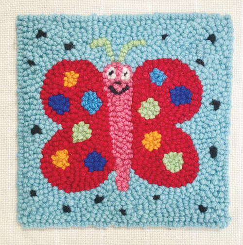 Happy Butterfly, 8" x 8", wool yarn on monk’s cloth. Designed by Isa Beniston and punched by Christie Beniston, Solana Beach, California, 2019.