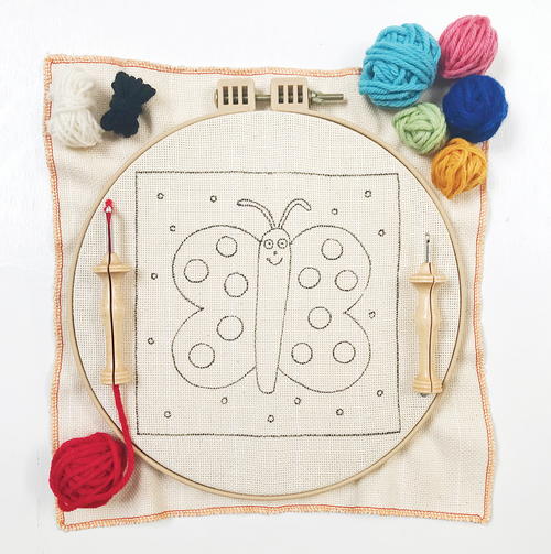 - 3- or 4-ply rug yarn in the following colors: light blue, light green, gold, red, pink, dark blue, white, and black