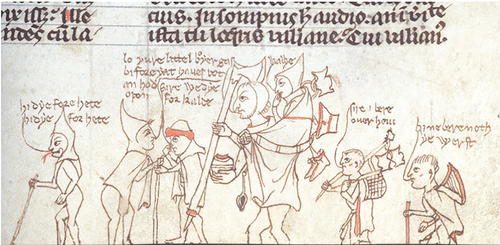 One example in Figure 1: The drawing c.1300 shows a group of people walking and “speaking” with lines of type attributed to each character by a thin line. This merry scene bears more than one parallel to a modern comic book story.