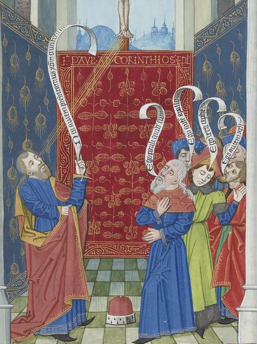 But there was another way to make a silent figure on the page speak out: the banderole—a kind of scroll. This clever device gave the illustrator the ability to make someone deliver a short statement via a tiny scroll that could originate in one’s hand or from one’s lips.