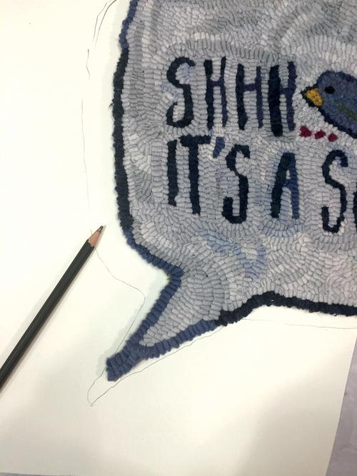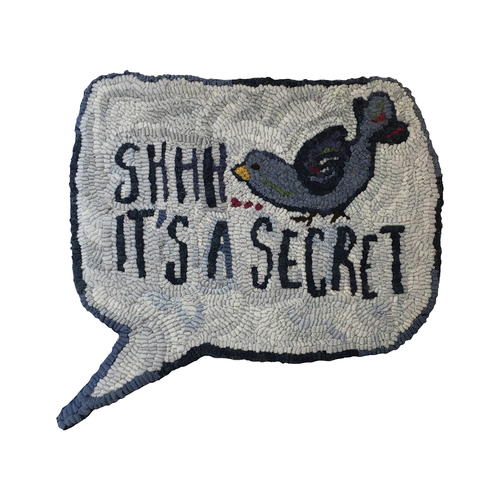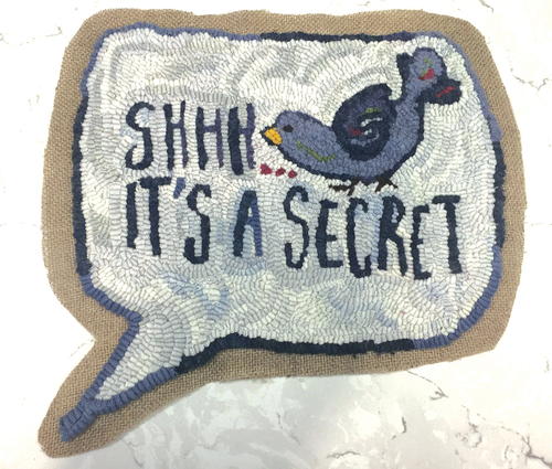 It’s a Secret Speech Bubble, 12" x 11½", hooked in multiple cuts of wool. Designed and hooked by Ellen Banker, Williamsburg, Virginia, 2019.