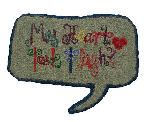 My Heart Took Flight Speech Bubble, 18” x 14”, hooked with wool yarn. Designed and hooked by Jon Sullivan, Salem, Massachusetts, 2019. Note: The typeface is Dollhouse.