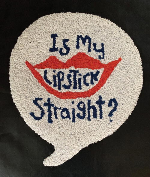 Lipstick Speech Bubble. Designed and hooked by Joanne Millen, Rockport, Massachusetts, 2019.