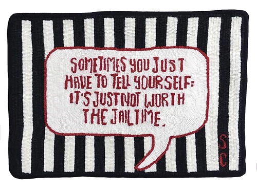 Jail Time Speech Bubble. Designed and hooked by Sue Cunningham, Mahone Bay, Nova Scotia, 2019.