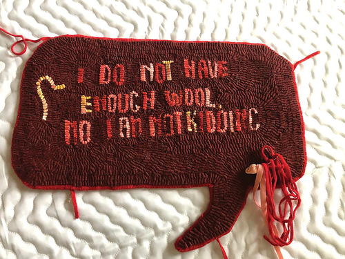 Enough Wool Speech Bubble, 18" x 14". Designed and hooked by Lorraine Foster, Waitsfeld, Vermont, 2019.