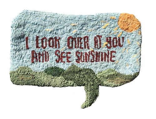 Sunshine Speech Bubble, 18" x 14". Designed and hooked by Susan Stoehr, Warren, Vermont, 2019.