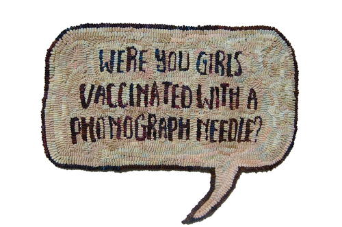 Vaccinated Speech Bubble, 18" x 14". Designed and hooked by Suzanne Dirmaier, Waterbury Center, Vermont, 2019.