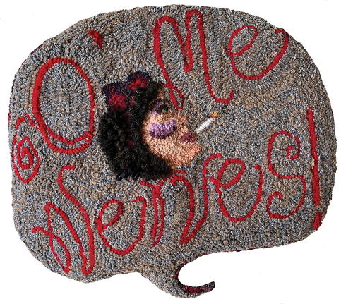 O’ Me Nerves Speech Bubble. Designed and hooked by Winnie Glavine, Paradise, Newfoundland, 2019.