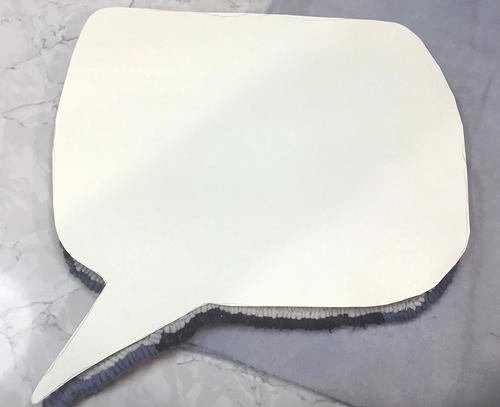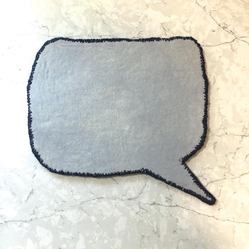 It actually isn’t a secret! To make a speech bubble conform to its shape, it needs to be stabilized and cut out of the background. Then the edges should be clipped and turned under, sewn down, and prepared for its backing material. You will need to make a pattern for the back, pin the two pieces together (and possibly baste the two pieces together), and whipstitch the edges with wool yarn that can be a matching or contrasting color.