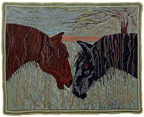 Eli and Gordon, 40" x 50", wool on linen, with hand-dyed, whipped binding. Designed and hooked by Linda Beaulieu, The Villages, Florida, 2018.
