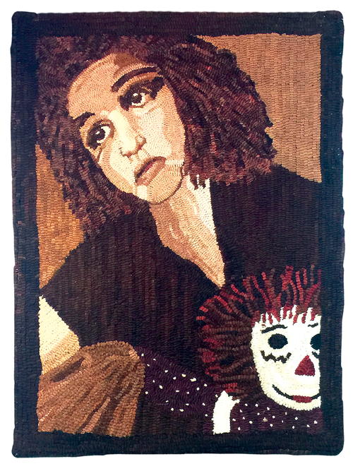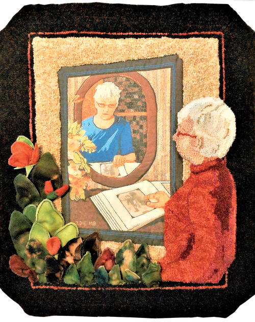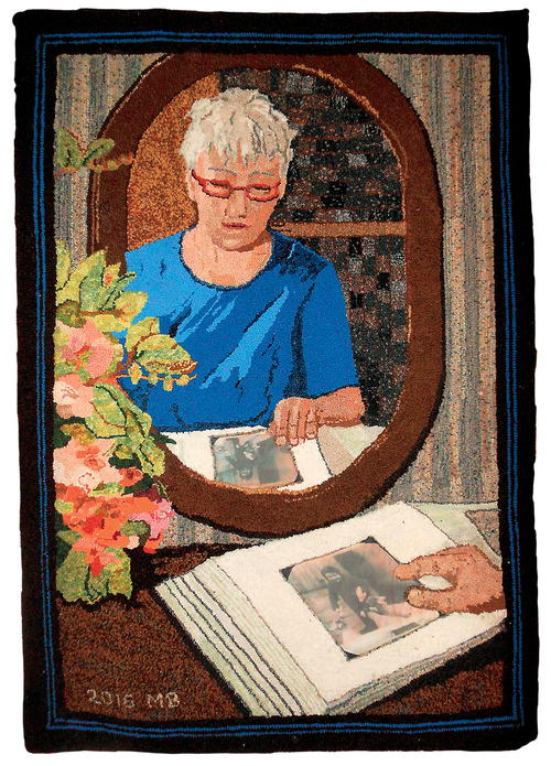 This rug presents a self-portrait in the form of a rug within a rug. The foreground is enhanced and brought to the front by the appliquéd plant forms, while Marilyn herself “reflects” on the old family photograph in her mirrored reflection. Marilyn has created a series of intimate family-centered hooked rugs, priceless heirlooms for the ones she loves.