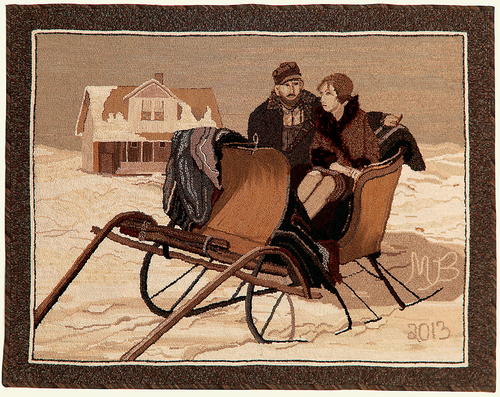 “Marilyn shows her mother, Mary Rose, in the horse-drawn sleigh in which she accepted Marilyn’s dad’s proposal of marriage. Marilyn used eyelash yarn for her mom’s collar and cuffs, and one of her father’s shirts for his shirt.”