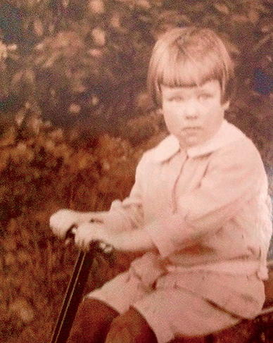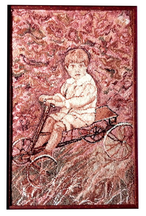 Roger W. Thwing, Age 4, 16" x 24", single wool threads, #2- and 3-cut wool on cotton monk’s cloth. Adapted from a 1918 family photograph, and designed and hooked by Janet Conner, Hiram, Maine, 2016.