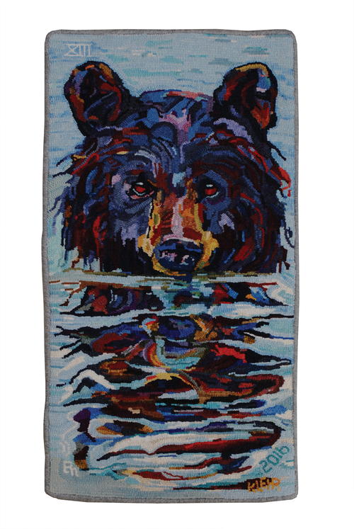 Very Wet Bear, 17" x 34", #4- and 5-cut wool on linen. Adapted from a postcard by Kari Lehr Art; designed and hooked by Russell L. Nichols, Green Valley, Arizona, 2018.