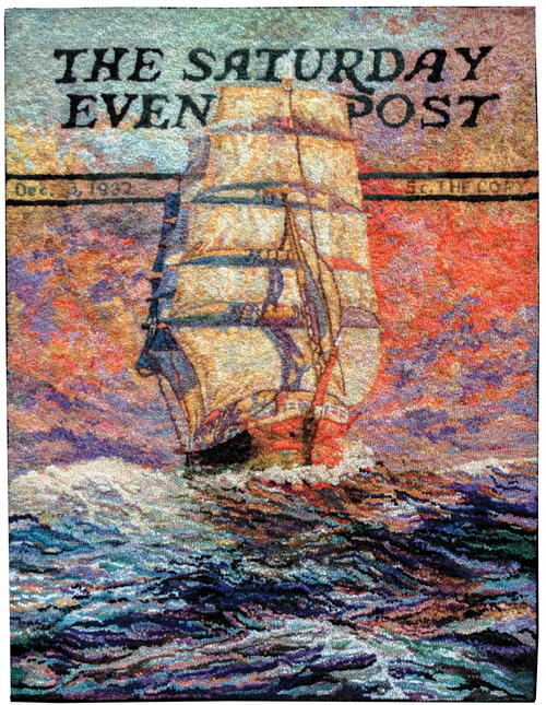 Red Sky at Morning, 25" x 33", #3-to 5-cut hand-dyed and as-is wool on monk’s cloth. Adapted from a 1932 cover of The Saturday Evening Post and designed and hooked by Nancy Samuels, La Canada Flintridge, California, 2018.