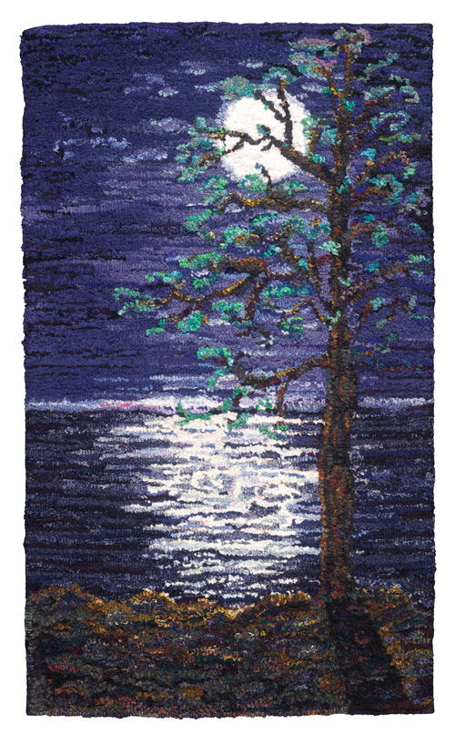 Into the Mystic, 13” x 22”, #3- and 4-cut hand-dyed wool on linen. Designed and hooked by Nancy Myer, Lancaster, Pennsylvania, 2017. Impact Xpozures