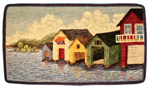 Canandaigua Lake Boat Houses, 28" by 16", #3- to 7-cut wool on linen. Designed by and similar pattern available from Michelle Palmer, hooked by Kathy Peters, 2019.
