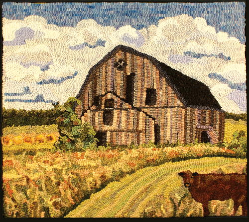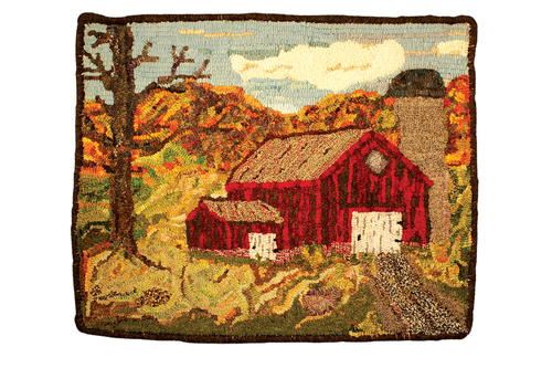 Country Barn, 20" by 16", #4- to 6-cut wool on linen. Designed by Davey DeGraff and Caryn Devlin and hooked by Barb Snape, 2019. “Using worms from my stash, I tried hooking in the painterly style.”