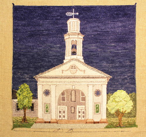“The Congregational Church has always been on my radar to hook. Built in 1812, it’s the oldest building in Canandaigua and was designated a National Landmark in 1958. The church sits on a slight incline on Main Street above the city of Canandaigua. It’s a simple, beautiful Federal-style building with a towering spire housing a two-ton bell. It absolutely cries out to be memorialized in wool. The church looks white but is actually a light gray with white accents. I dyed 10 shades of gray for the church and three greens for the trees. The dark blue for the sky was a suggestion of the hooking group to provide better contrast for the church. The church was an enormous challenge but one which I very much wanted to do.” -