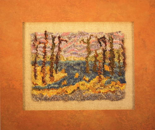 South End of the Lake, 7" by 10" hooked area, 16" by 19" framed, mainly #5-cut wool. Hand-dyed wool, recycled wool, hand-dyed nylon (pantyhose), wool roving, yarn, and silk on linen. Designed and hooked by Darlys McDonough.