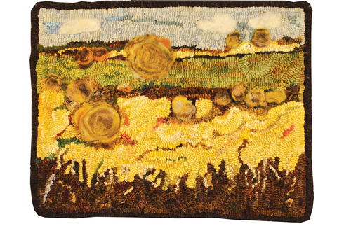 Haystacks, 14" by 11", #3-, 4-, and 5-cut wool on linen. Designed by Molly Colegrove and hooked by Barb Snape, 2018.