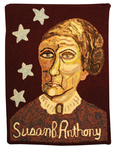 Susan B. Anthony: FAILURE IS IMPOSSIBLE, 18" by 28" framed, #7-cut hand-dyed wool on linen. Designed and hooked by Diane Phillips.