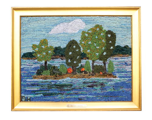 Squaw Island, 19" by 15" with frame, #4-cut wool and bits of Safari Silk on linen. Pattern based on past and present images of Squaw Island. Hooked by Barbara Kutner, 2019.