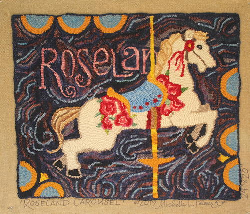 Roseland Carousel, 24" by 20", #4-, 6-, and 8-cut wool on linen.Designed by Michelle Palmer and hooked by Susan Donovan, 2019.