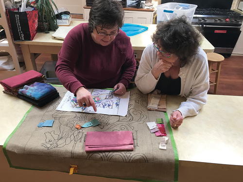 Michelle Palmer, left, and Susan Donovan color planning the carousel rug.