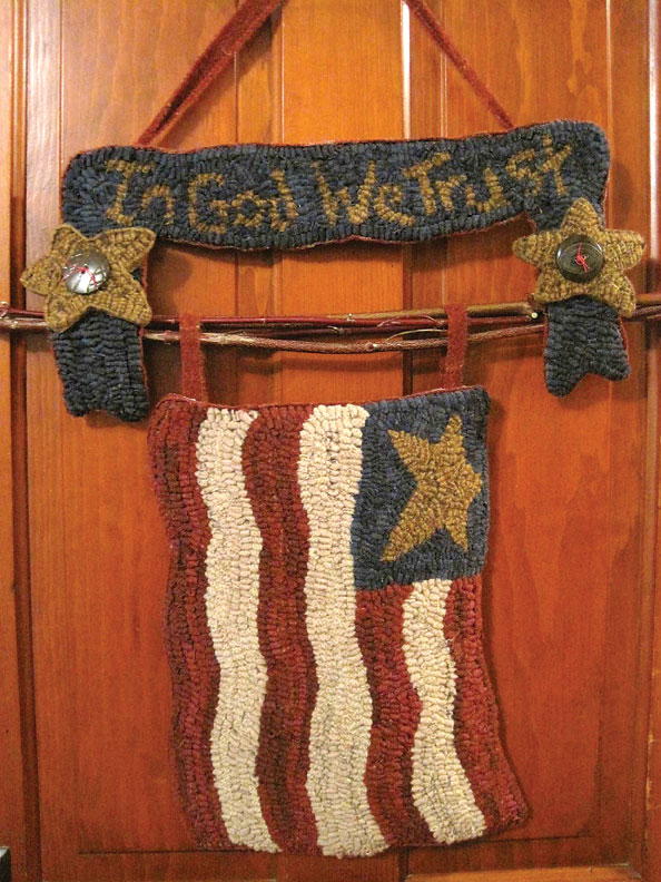 Welcome summer visitors with this hooked flag! Summer is warm weather, sunny days, and waving flags. My primitive pattern is a wall flag for your home, with a banner and accent stars, attached to a twig bundle.