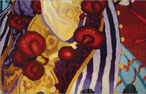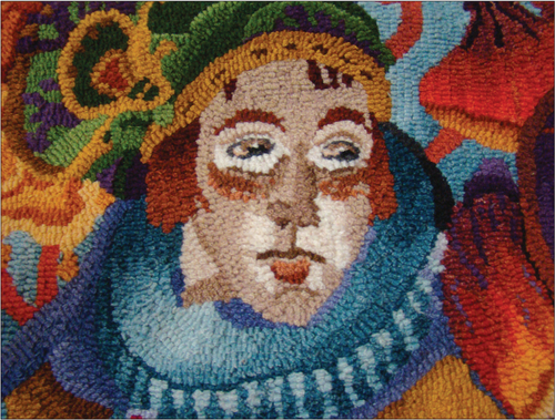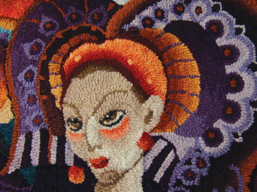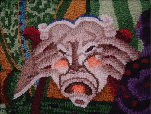 The Theft of Comedy, 36" x 48", #3-cut wool on rug warp. Designed by David Galchutt, pattern available from LC Wool ’n Silk. Hooked by Sibyl Osicka, Parma, Ohio, 2019.