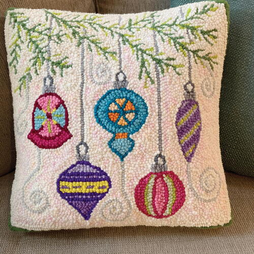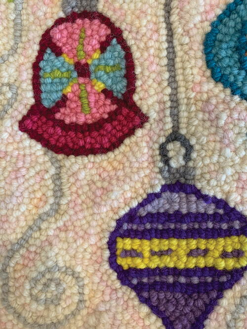 Vintage Christmas Ornaments, 16" x 16", hand-dyed rug yarn by StoryTeller Wool on monk’s cloth. Designed and punched by Rebecca Martin, Longmont, Colorado, 2020.