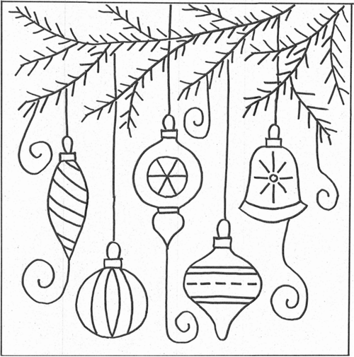 There are many single lines in this design. The borders of the ornaments, the strings they hang from, the needles of the pine tree—all are single lines. These must be punched six per inch. If they are stretched out, they will appear like polka dots and not give the appearance of a solid line.