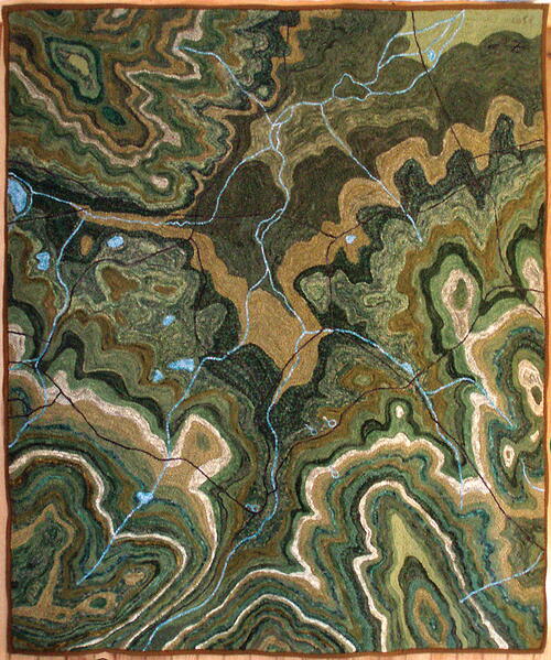 I began my topographic rug at the Highlands Rug Camp with Gail Dufresne in March 2005. I dyed a mass of greens and tans and assigned one color to each elevation. I picked out a nice medium blue for all the creeks and streams, and an off-black for the roads. I hooked it all in #5 and #6 cuts.