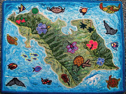 I hooked this rug in memory of a wonderful family Christmas vacation in Oahu. We toured the island enjoying the snorkeling, turtles, big surf, shrimp shacks, ukuleles, and magnificent flora. One small area of the rug has a special meaning to me. As I was snorkeling in a lagoon, I got caught as the tide changed and was pulled out to sea. I managed to hold on to a rope, and when that broke, I was pulled onto some rocks and was finally rescued. I now have a much greater respect for the ocean. -