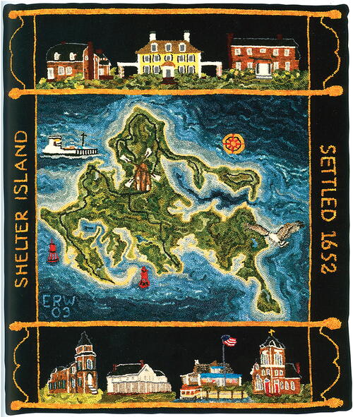 Historic Shelter Island, 32" x 37 1 /2", #3-, 4-, and 6-cut wool on rug warp. Designed and hooked by Lissa Williamson, Severna Park, Maryland, 2003.