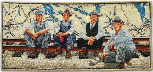Working on the Railroad, 36 1 /2" x 16 1 /2", #3- to 5-cut wool on linen. Designed and hooked by Trish Johnson, Toronto, Ontario, Canada, 2012.