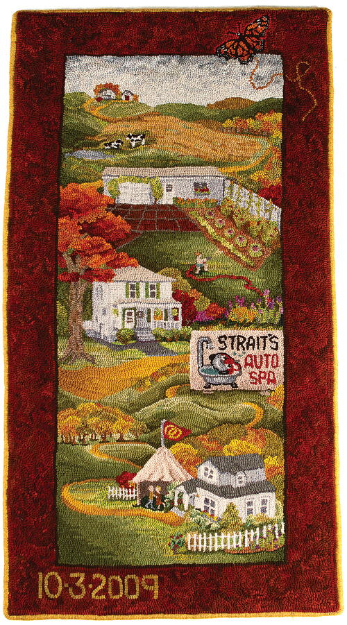 This rug was my first pictorial. I started designing at the bottom, which depicts my daughter’s outdoor wedding at her grand-mother’s home. I did not know whether I would enjoy doing a pictorial, so I decided that if I didn’t enjoy hooking it, I would stop with the lower house and make it into a pillow. As you can see, I enjoyed it so much that I went on to include my daughter and son-in-law’s present home, garden, and garage. In the distance is the boyhood farm home of my son-in-law, which was to be razed; however, since the completion of the rug, they have decided to renovate the house and make it into their new home. So the rug is not only a map mat, but it’s also a timeline of our time together. TRISH JOHNSON -