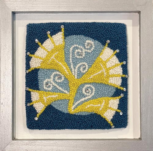 Shine!, 8" x 8", wool yarn and sequins on monk’s cloth. Punched with #13 and #14 Oxford punch needles. Designed and punched by Rebecca Martin, Longmont, Colorado, 2021.