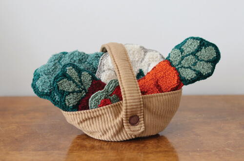 I began to brainstorm. Like most of my ideas, the inspiration came from my oldest daughter. “Mum, you should hook some fruit and vegetables that your grandchildren can use in their play kitchen.” And that is exactly what I did. My grandchildren have a little play kitchen complete with oven, stovetop, and refrigerator. The wheels began to turn and, before I knew it, I was hooking a variety of foods with all those leftover linen pieces. The nice thing about hooking food is that it comes in all sorts of shapes and sizes, which is perfect for using up those scraps. I was also able to hook my grandchildren’s favorite foods, allowing them to use their imaginations to make their dad’s favorite sandwich or a bowl of carrot soup. Store-bought food items are often limited in their variety.
