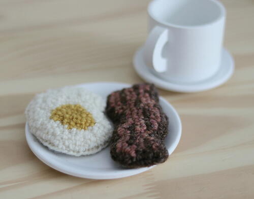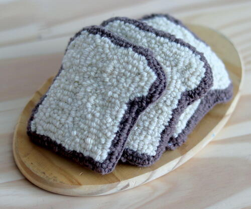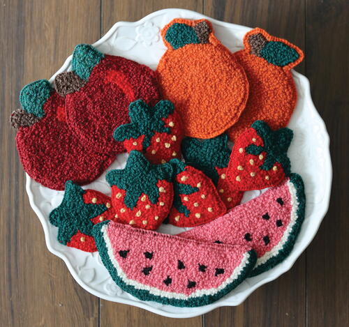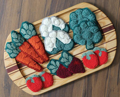 I started with Bacon and Eggs, but I was soon on a roll. By the time I said “enough,” I had hooked 14 varieties of fruit and vegetables—more than 40 little rugs in total (obsess much?). Needless to say, I no longer have any unused pieces of linen in the house, and my grandchildren are very happily cooking up fine cuisine to serve to anyone who ventures into their home
