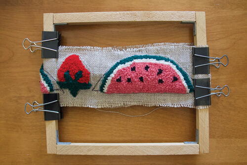 To make the fruit and vegetables, I used one of my smallest frames to stretch the linen. A small hoop frame is also good for doing this. Once a piece was hooked, I removed the linen from the frame, covered it with a clean dish towel, and used an iron to flatten (no steam). Then, to keep the pieces from unravelling, I carefully used a zig-zag stitch to sew as close to the hooking as I could without catching any of the loops. After cutting around the stitching I was ready to put on the backing. The edge was folded to the back and a piece of felt, cut to the shape of the fruit or vegetable, was sewn on using matching yarn. I used a blanket stitch to sew the felt to the back so the linen would not show in the finished piece.