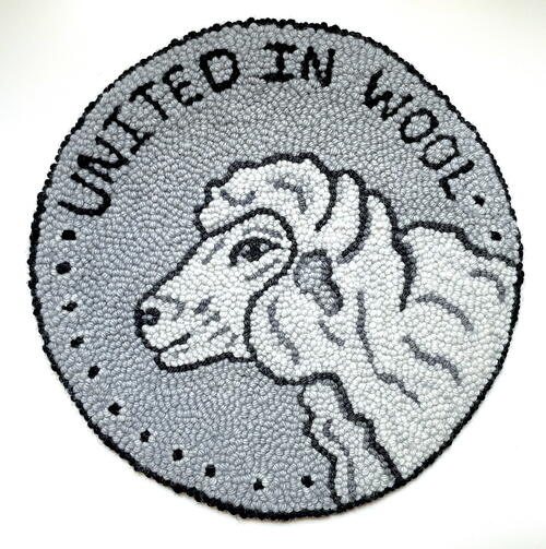 The head of my coin is a sheep. Coins usually have the bust of a monarch or president on the head of the coin—I figured a sheep would be the monarch. Wool is my primary medium in either punching or hooking, and I have a tender spot for sheep in general. I spin and have hands-on experience with sheep fleece. For me, the fluffy nature of sheep wool made yarn an easy choice for the head of the coin—it simply felt more “wooly” than wool strips, as odd as that sentence reads. I like how yarn flows effortlessly through the punch, so I decided that the front of the coin would be my punched side. -