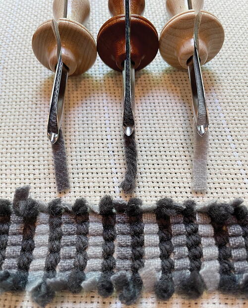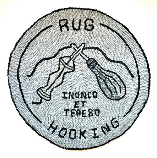 The design of the piece is another aspect to consider. I find myself reaching for the hook for smaller, more detailed designs, whereas the punch is my go-to tool for a piece that is larger than 2' x 3'. When I am working on a large scale, I find I can get all the definition I want from the fluffy loops of the yarn, and the process is much faster. The question of whether to hook or punch a piece is a personal preference. In many ways, I feel it comes down to chance—a coin toss if you will. What tool was placed in your hand first? Chances are that will be your tool of choice. I feel passionately about passing rug hooking on to others, so for me it is less about either the hook or the punch. It all comes back to that running loop stitch that unites the two tools. I want you to learn it. Now, which tool will best get you there? Heads or tails? Both sides will bring you luck. RHM