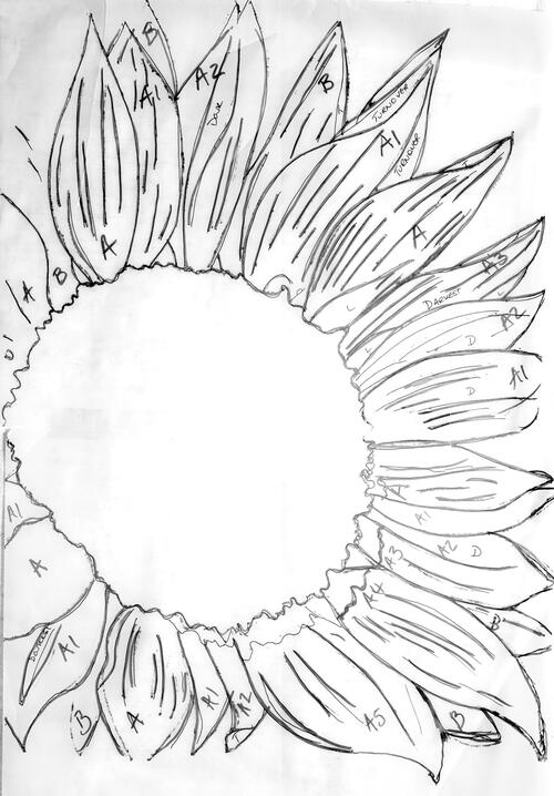 Start by punching the A petals inside the pattern outline. Punch an outline in the lightest value; then add your highlights in the light value too. Next punch the shadows in a dark value. Finally, fill with a selection of medium values. You will need a textured dark-brown yarn to separate all your petals.