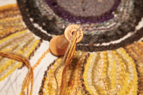 I have punched this pattern too (in 3 days!). Dip into all those wonderful goodies you’ve bought over the years and create a contemporary punched rug. I wanted to create dimension so I used Oxford Punch Needles 8R, 9R, 10R, 11R, 12F, and a Craftsman Punch. The Craftsman Punch covers sizes 1-10—it is a handy tool, but it does not take kindly to sari silk. For that it is better to use an Oxford punch tool.